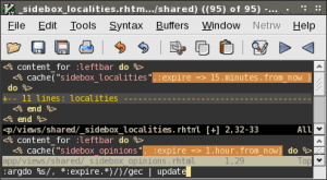 I used this technique in about 25 of my templates. Then i decided not to use timed expiration of the cache. So I needed to remove the expire argument of the cache method. I needed to remove it from all of my 25 templates. I used Vim to find the needed piece of text to be removed.