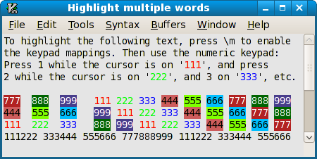 For example, if you place the cursor on the word “rain” and press 4 on the keypad, all occurrences of “rain” will be highlighted (use :hi hl4 to show the colors). No highlighting will occur in words like “rainbow”.